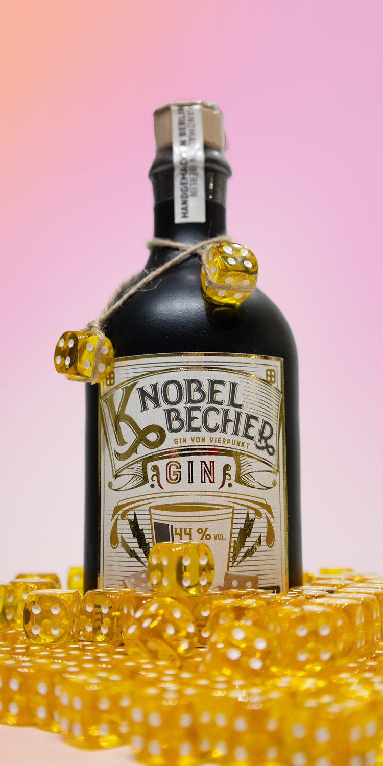 Nachdem wir uns mit unseren eigenen Biersorten bereits einen Traum abgefüllt haben, haben wir uns entschieden, einen eigenen Gin zu gestalten. Streng limitiert und handnummeriert ist unser güldener (K)nobelbecher ein guter Begleiter für süffige Würfelspiele. Dank 44 % Alkohol fällt auch nicht gleich jedem auf, dass die Würfel nach VIERPUNKT-Manier natürlich nur 4er auf jeder Seite haben. Das Schöne ist: Es gibt hier keine Verlierer und die Zecherei kann unendlich lange weitergehen.