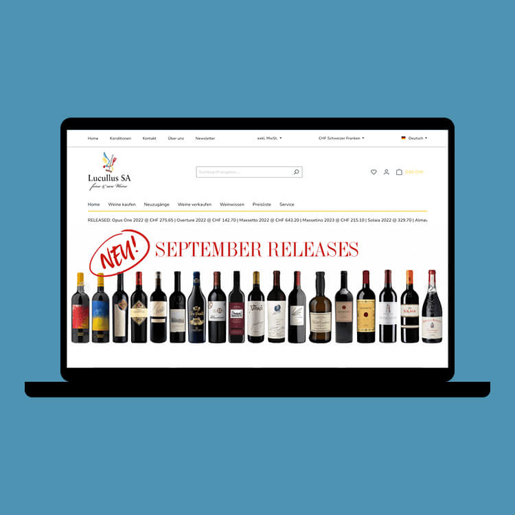 Für unseren Kunden Lucullus SA, einen führenden Schweizer Anbieter exklusiver Weine für Gastronomie und Handel, haben wir die technische Betreuung und Weiterentwicklung des bestehenden Shopware 6 B2B-Shops übernommen.