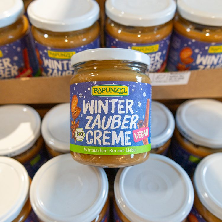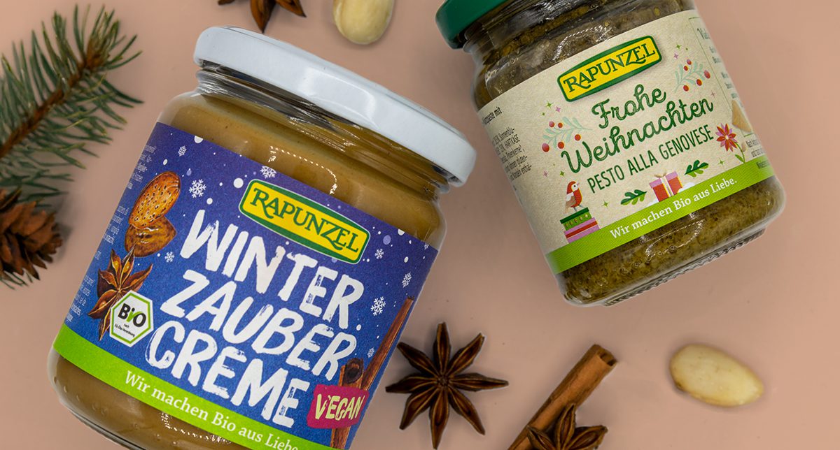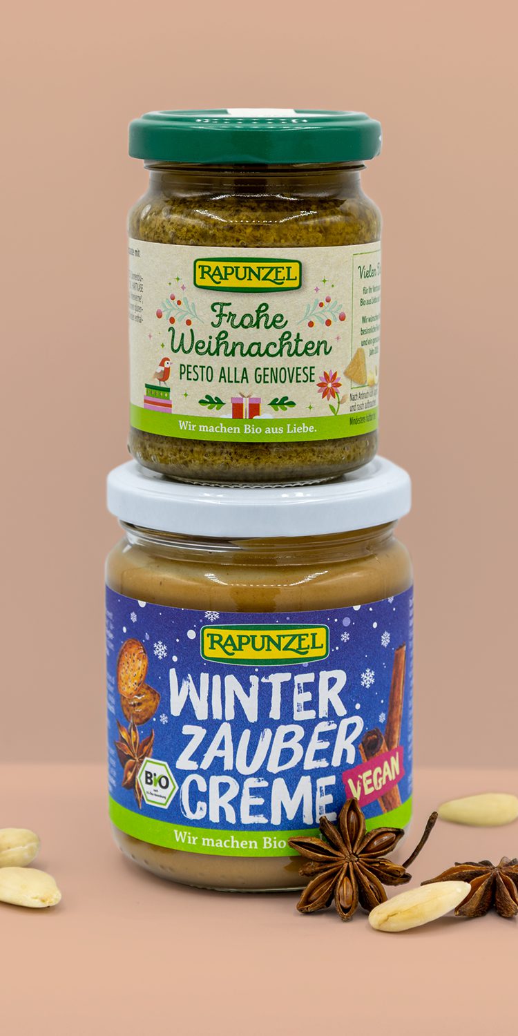 Für Rapunzel durften wir zwei besondere Weihnachts-Special-Editionen gestalten: die „Winterzaubercreme“ als limitierte Erweiterung der Nusscreme-Reihe sowie das „Pesto alla Genovese“ im festlichen Gewand.